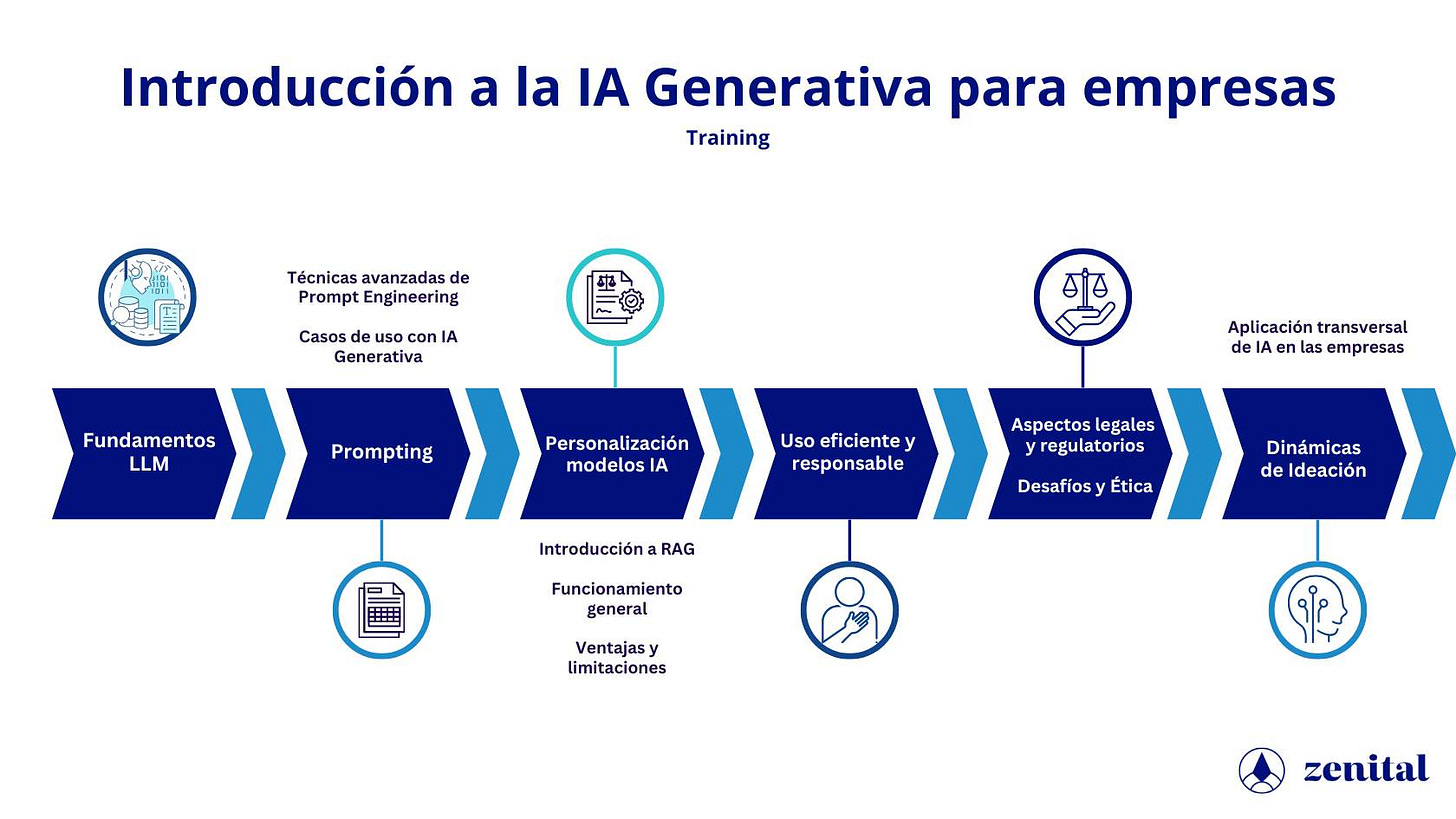 Por eso hemos desarrollado un programa de training de introducción a la IA generativa para empresas, que nace de nuestra experiencia de años trabajando con clientes y de nuestra apuesta por las IAs generativas.