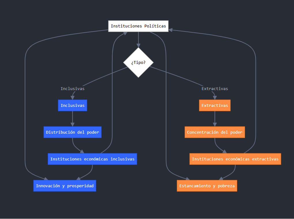 Las instituciones inclusivas generan incentivos que premian el esfuerzo, la innovación y la inversión a largo plazo; mientras que las extractivas crean incentivos para la búsqueda de rentas, la corrupción y la explotación a corto plazo.