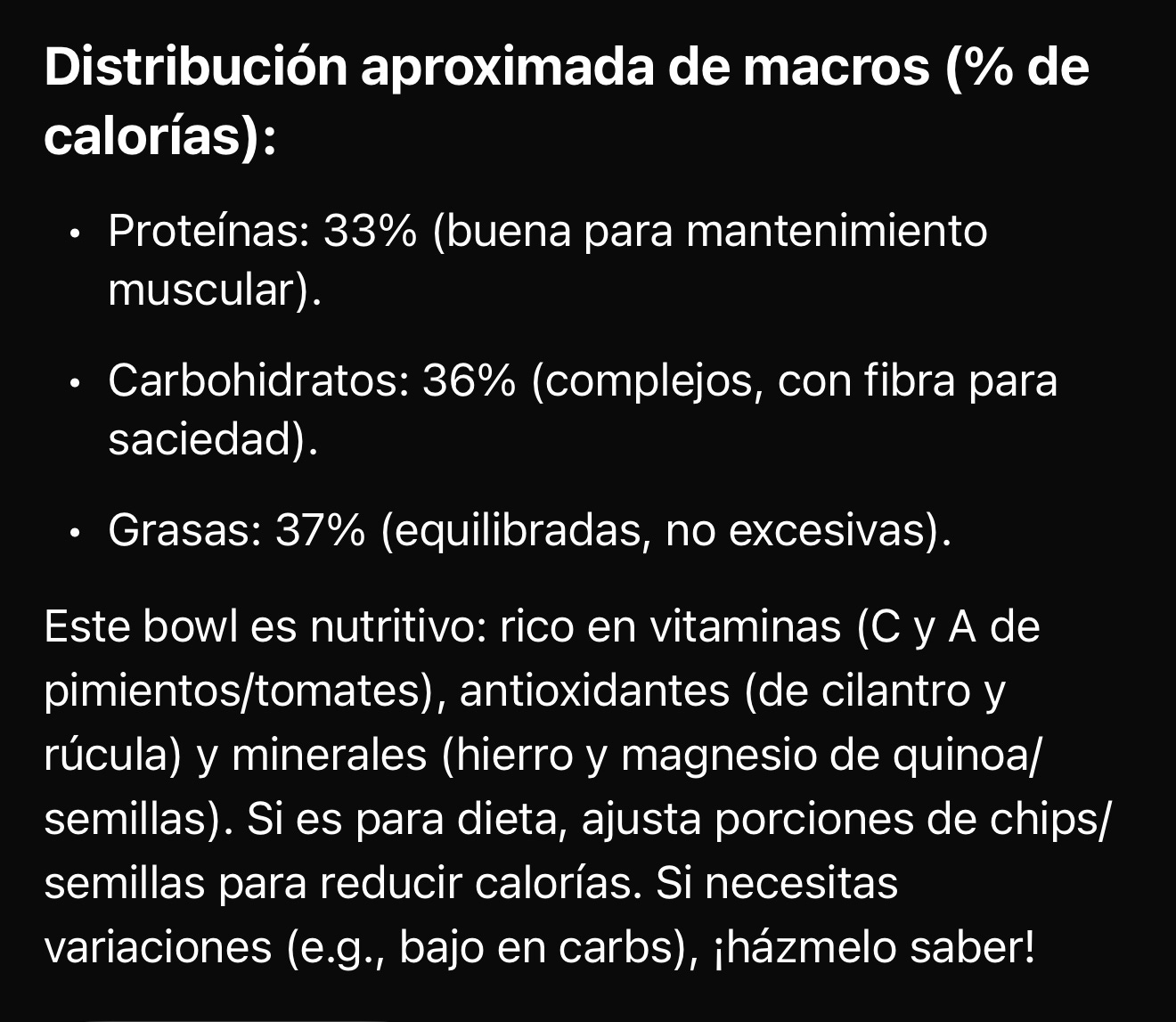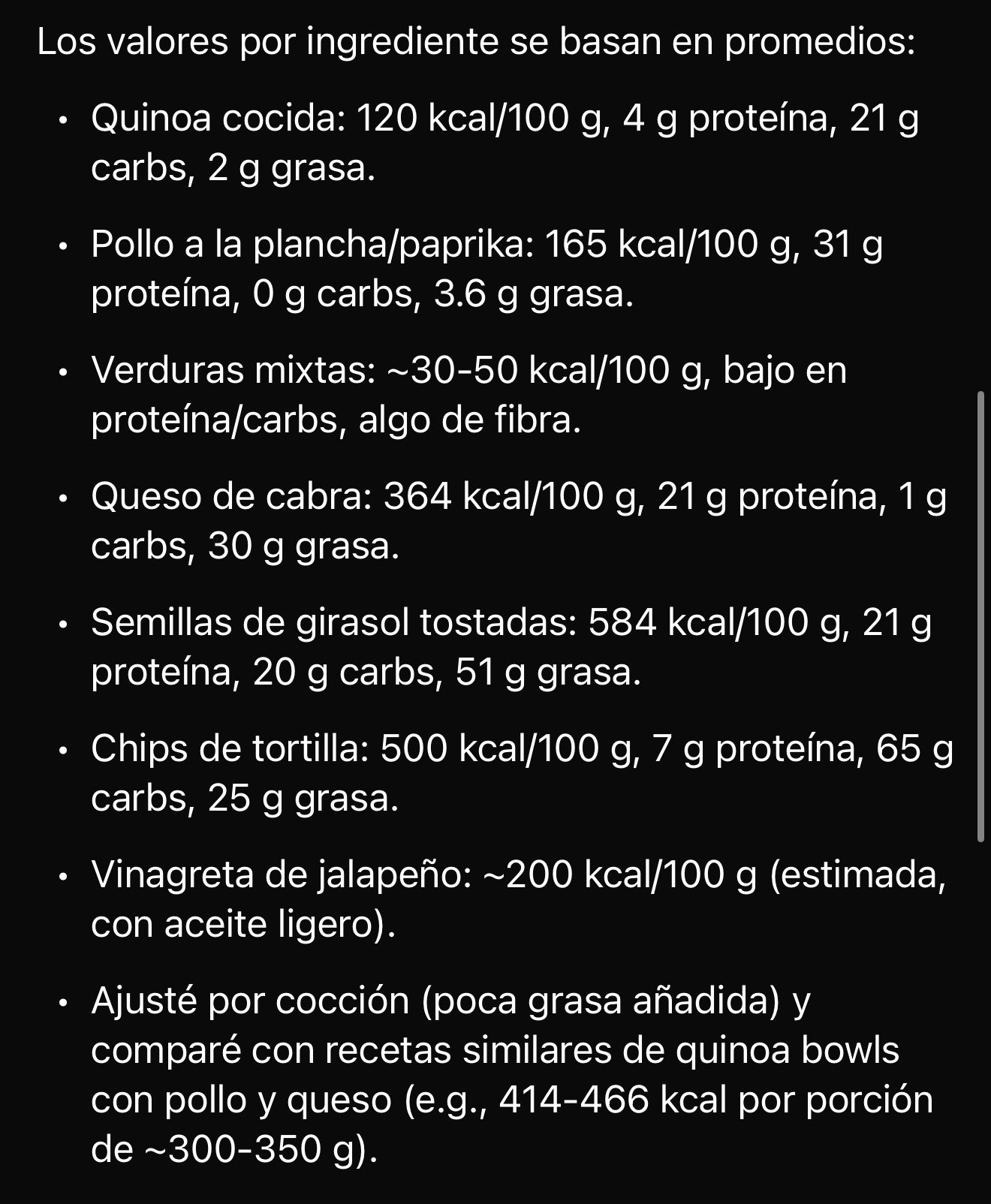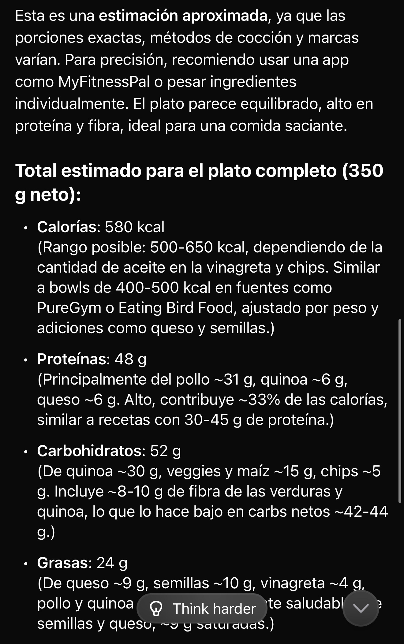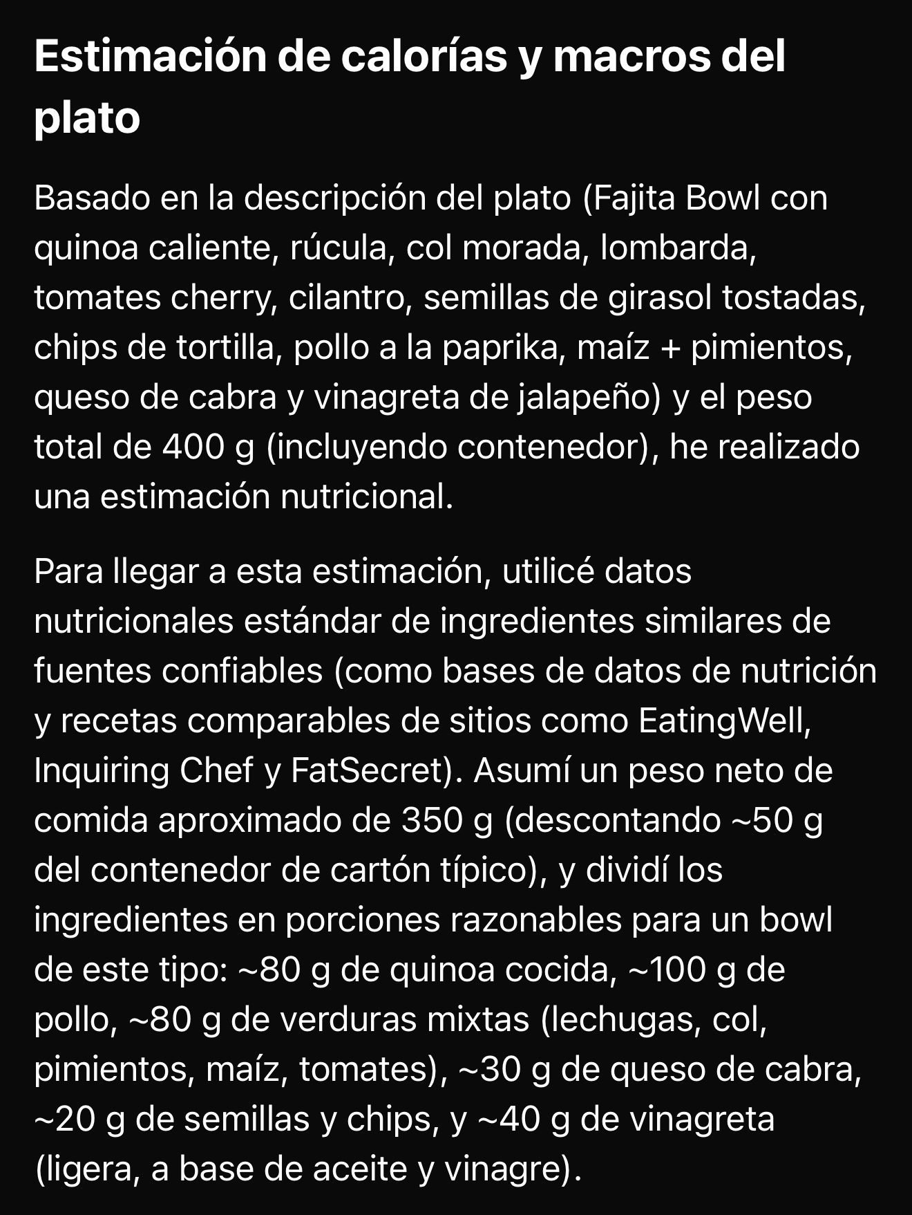Si el plato es imposible de trackear a mano, la IA puede ayudar a llegar a algo aproximado. Los mejores resultados los he obtenido con Grok.