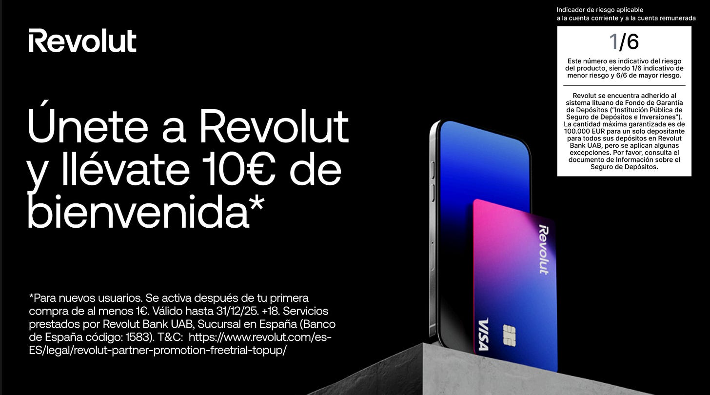 *Para nuevos usuarios. Se activa después de tu primera compra de al menos 1€. Válido hasta 31/12/2025. +18. Servicios prestados por Revolut Bank UAB, Sucursal en España (Banco de España código: 1583). T&C: https://www.revolut.com/es-ES/legal/revolut-partner-promotion-freetrial-topup/ Contando calorías y macros