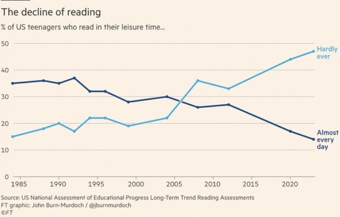 Cada vez leemos menos libros. Yo el primero. Como señala Tyler Cowen en su última columna, nuestra cultura se transmite cada vez más a través de podcasts, YouTube y TikTok, y cada vez menos a través de los libros. Es un cambio profundo, y es difícil pensar que no tenga consecuencias.