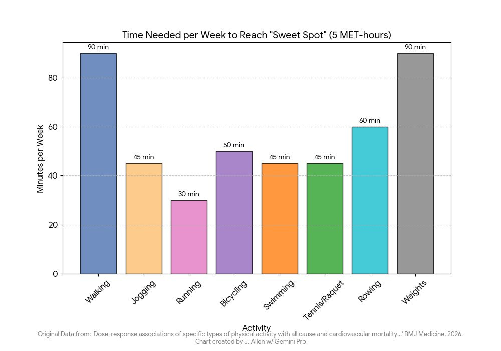 El “punto dulce” de reducción de mortalidad se alcanza con volúmenes muy pequeños. Si, como hace este profesor de Harvard, crees que el “punto dulce”, es decir, la mayor ganancia de longevidad está en torno a los 5 MET-horas/semana, fíjate que poco tiempo se requiere, por tipo de actividad: