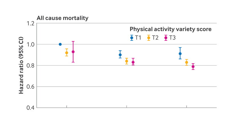 La principal —y quizá sorprendente— conclusión es que la variedad de actividad física se asocia con una menor mortalidad, independientemente de la cantidad total de ejercicio realizada.Este estudio destaca por: