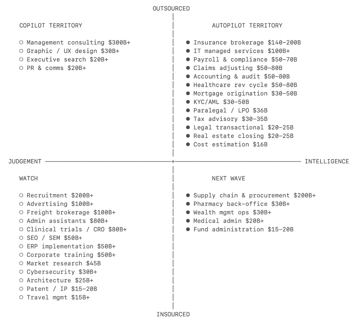 Cuanto más intensiva en inteligencia sea una profesión (y menos en juicio), antes ganará el autopilot (vender el resultado) al copilot (vender la herramienta).