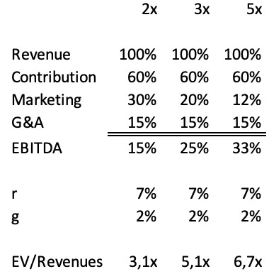 El valor del negocio con 1€ de ingresos y LTV/CAC = 2 es 3,1€ ó, lo que es lo mismo ya que los ingresos están normalizados a 1, el valor de la compañía se obtiene multiplicando los ingresos por 3,1x. Para un LTV/CAC = 3x el múltiplo de ingresos es de 5,1x y para un LTV/CAC = 5x nos vamos a 6,7x.