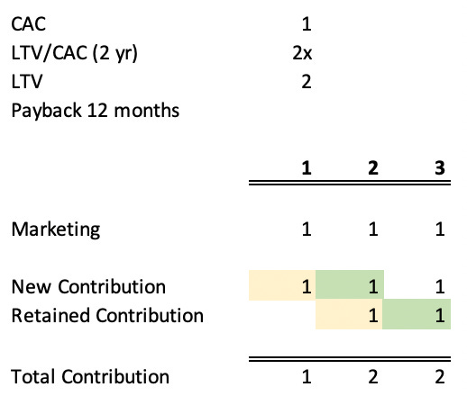 Observa que, en cada caso, la relación entre contribución y marketing es exactamente igual al LTV/CAC, como hemos venido diciendo. Como puede verse, el impacto en la rentabilidad de la compañía es muy significativo.