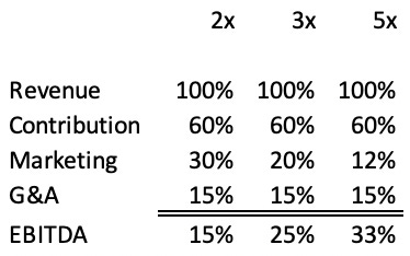 Veámoslo con un ejemplo. Sea un negocio para el cual la inversión máxima anual en marketing y ventas sin incrementar el CAC es de €10M, su LTV/CAC es de 3x y su margen de contribución es del 60% de los ingresos. En ese caso, los ingresos máximos o tamaño máximo de la compañía sería: €10M x 3 / 60% = €50M.