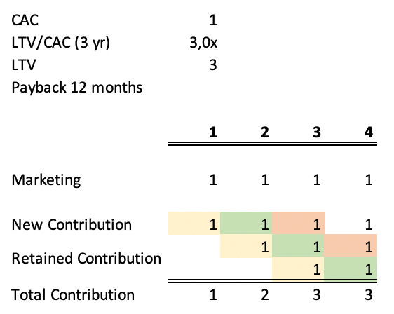 Ahora, a partir del año 3, el margen de contribución es exactamente igual a 3 veces la inversión en marketing.
