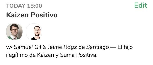 Además, hace poco días, hicimos una sesión conjunta en Clubhouse a la que llamamos—en contra del criterio de Jaime—Kaizen Positivo, en la cual hablamos sobre las trastiendas de su podcast y mi newsletter. Nos divertimos mucho y seguro que repetiremos en algún momento haremos un Suma Kaizen 😉.