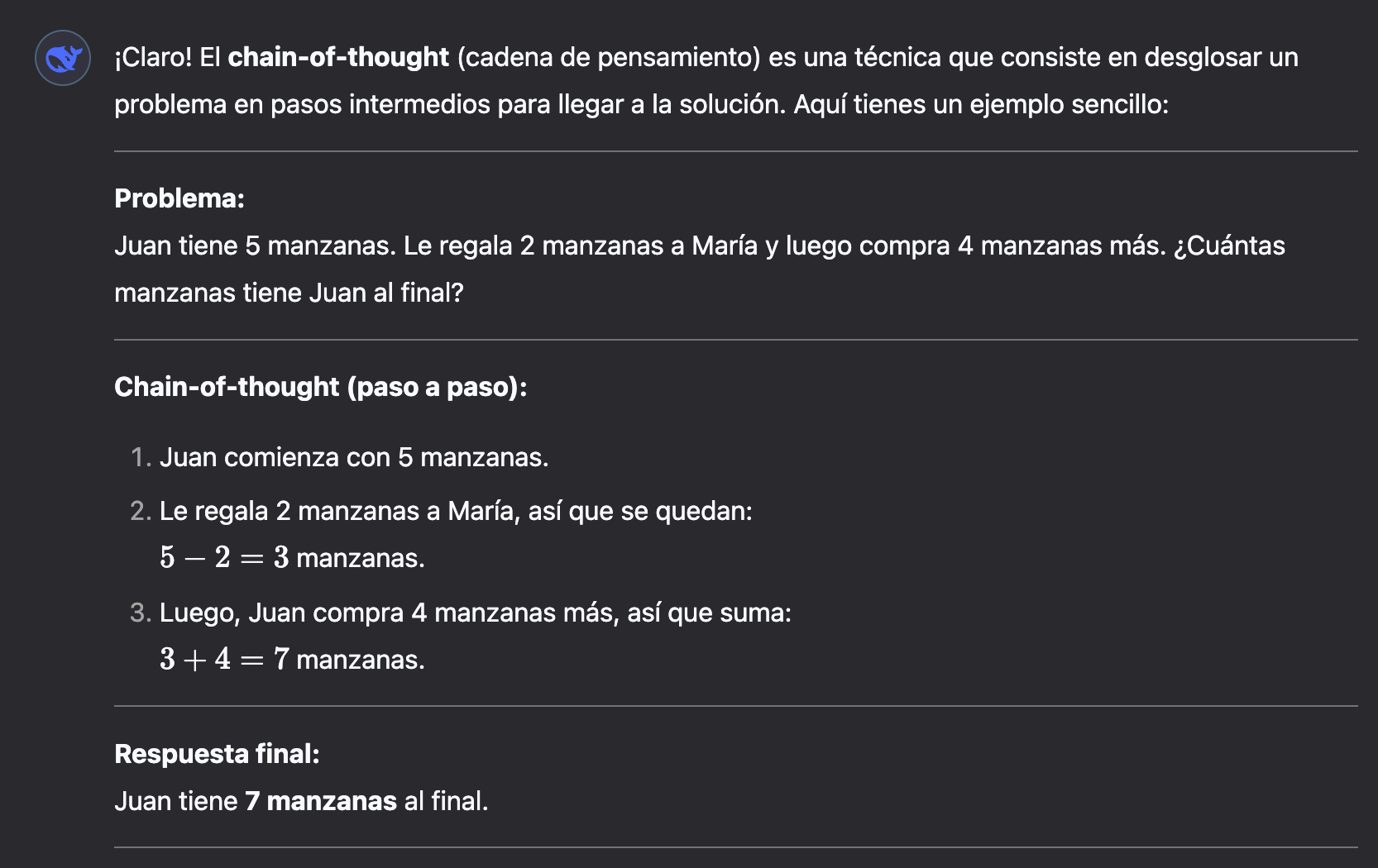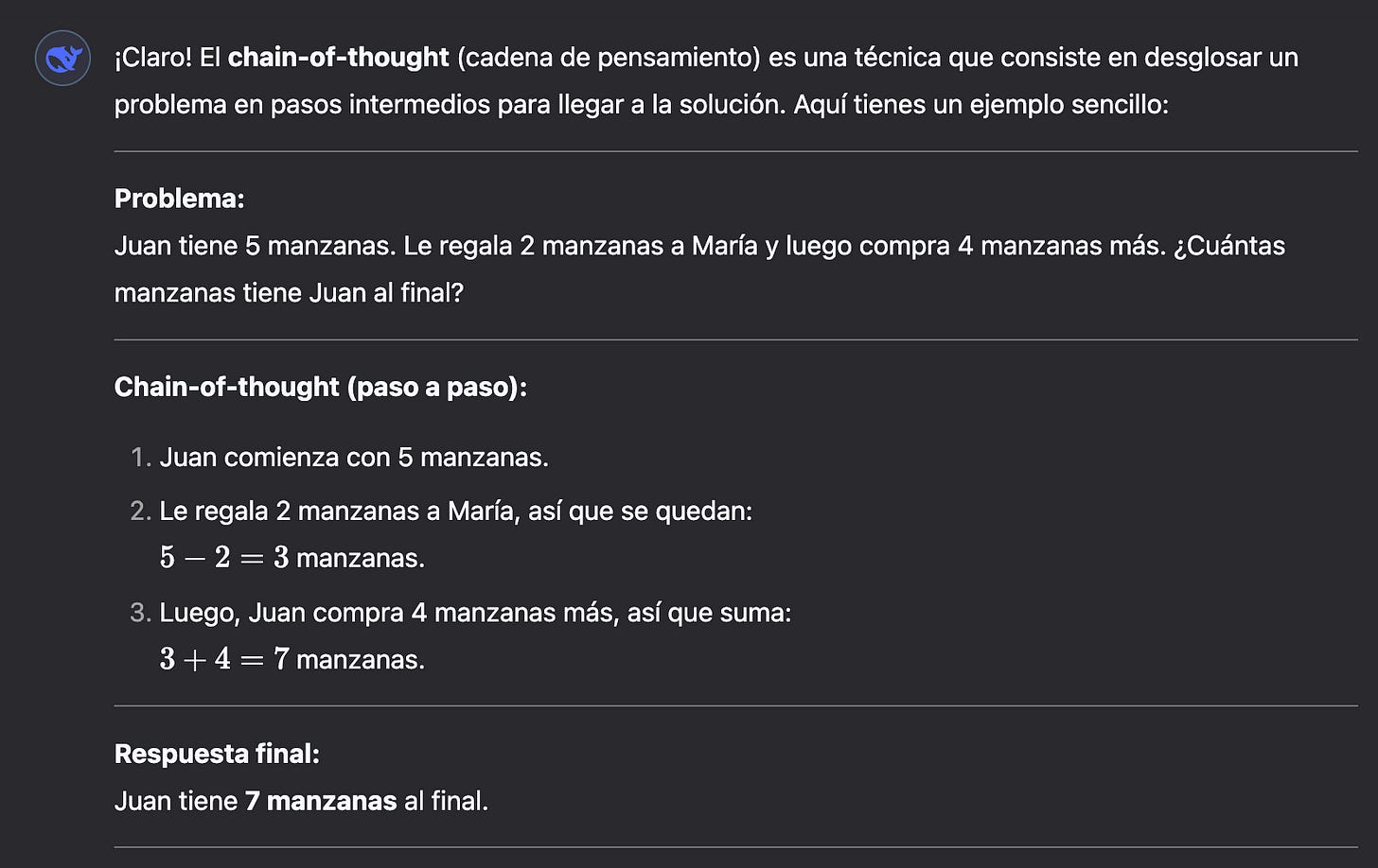 Una de las cosas más fascinantes es ver cómo modelos avanzados como DeepSeek-R1 o OpenAI-o1 “razonan”, es decir, descomponen un problema en pasos intermedios para llegar a un solución, en una secuencia de “pensamientos” llamada “chain-of-though”.
