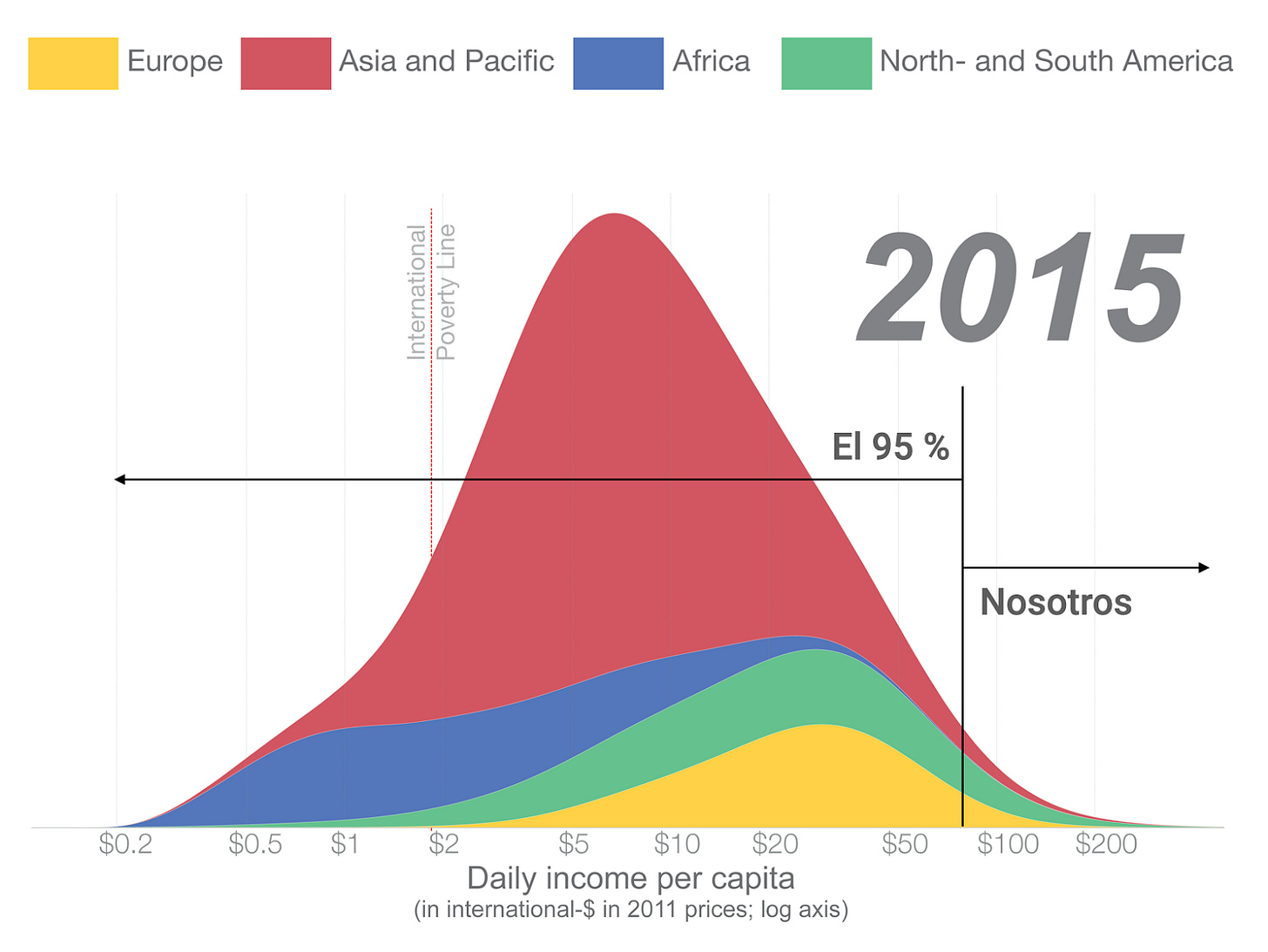 Un español medio, con unos ingresos anuales de en torno a 19.000 euros netos, está en el top 5 % del planeta. En otras palabras: con 19.000 euros, ingresas más que el 95 % de la humanidad. Podrías pensar que se debe a que las cosas cuestan mucho menos en los países más pobres… pero no: las cifras que te estoy dando son a paridad de poder adquisitivo. Hay diferentes formas de visualizar dónde estamos en el ranking de ingresos. Aquí tienes una: