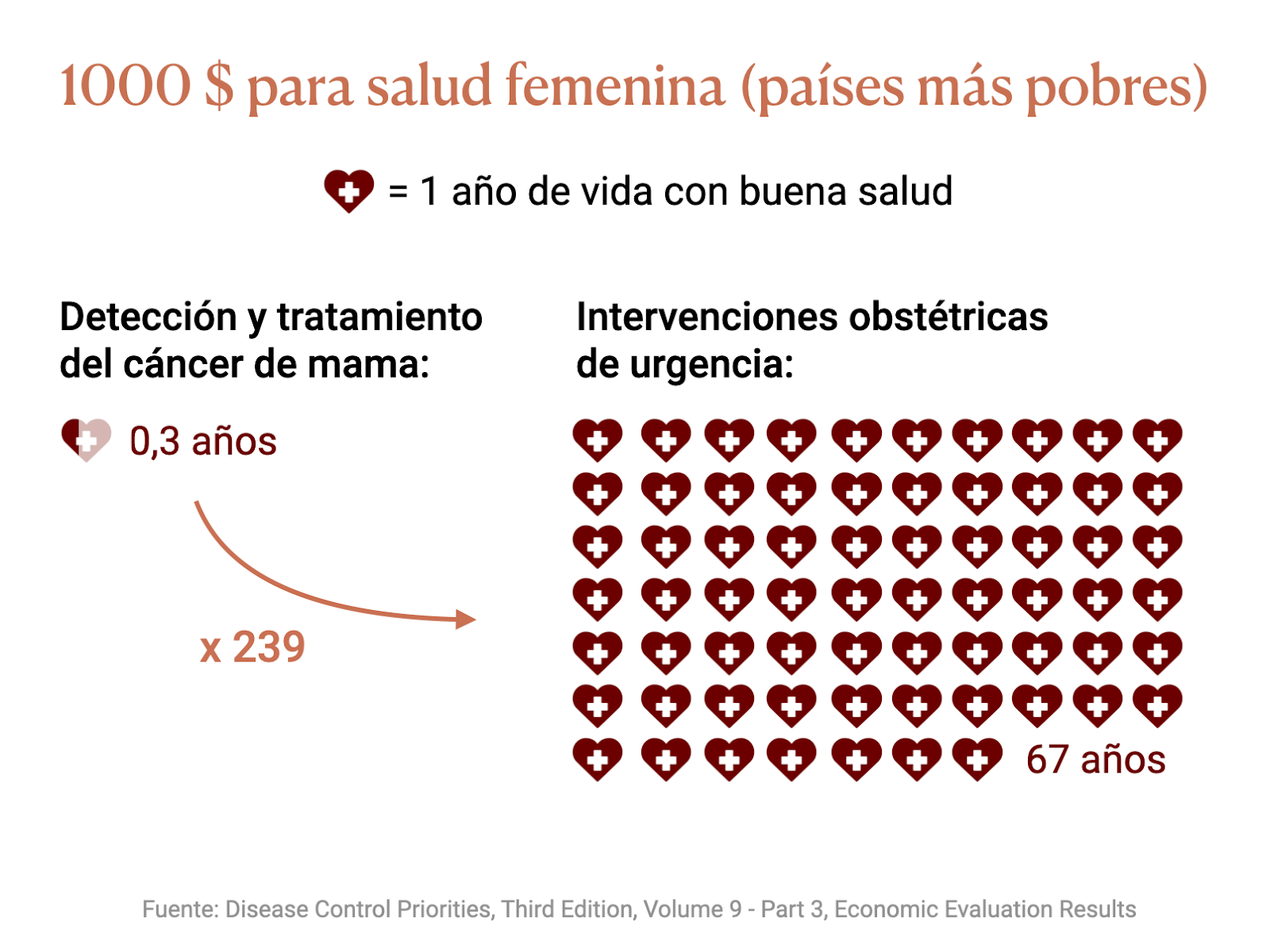 Cuando analizamos el impacto que consiguen diferentes ONGs, las diferencias son enormes: no hablamos de un 10% o un 20%, sino de órdenes de magnitud. Imaginemos, por ejemplo, que te preocupa la salud de las mujeres en África. Has leído que (como es de esperar) en muchos países de África subsahariana no hay recursos para prevenir el cáncer de mama. Sabes que esta enfermedad provoca muchísimo sufrimiento y decides que esa va a ser tu forma de ayudar: donar para prevenir el cáncer de mama en los países más pobres. Suena muy bien. Como eres una persona analítica, decides medir tu impacto y averiguas que, por cada 1000 dólares que donas, consigues añadir 4 meses de vida saludable para una persona necesitada. Sin embargo, resulta que esos mismos 1000 dólares destinados a intervenciones obstétricas de urgencia (ej: poder tener acceso a una cesárea vital) habrían ayudado a muchas más mujeres, añadiendo en total 67 años de vida saludable. Recuerda que lo que te preocupaba era la salud de las mujeres en África: eligiendo la segunda opción, tu impacto habría sido 239 veces mayor.
