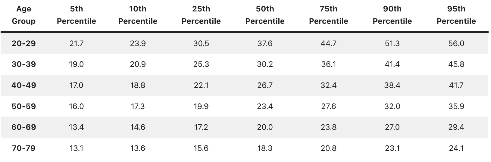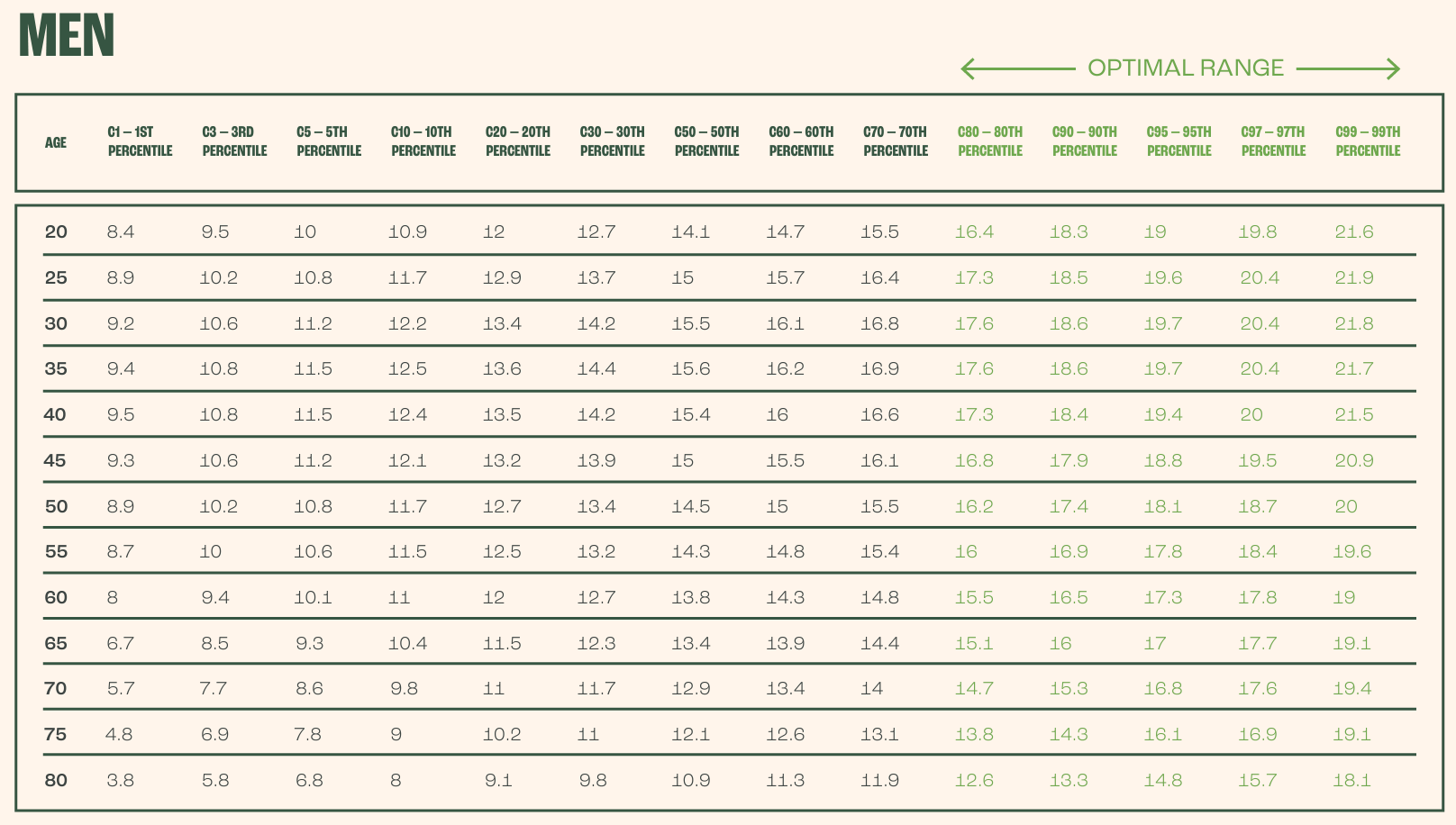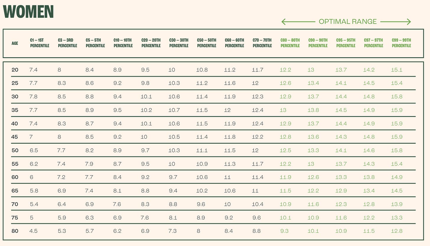 Para comparar los valores obtenidos, divide la medida de tu fuerza de agarre en kg por tu edad en metros elevada al cuadrado. Por ejemplo, una persona que mide 1,75m y que sea capaz de ejercer una fuerza de agarre de 37kg, tiene un valor normalizado de 37/(1,75)^2 = 12,08. Si fuese una mujer de 60 años la situaría (ver tabla más abajo) en un percentil 95 (óptimo).