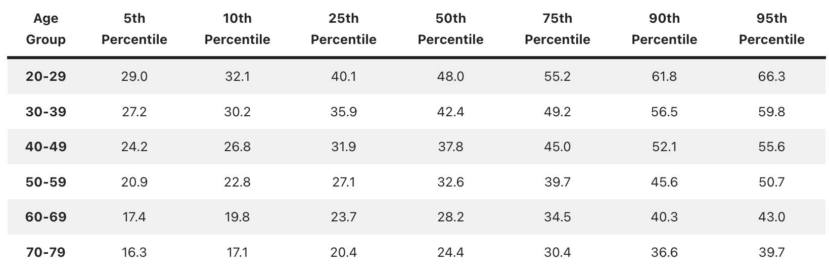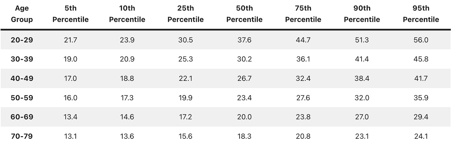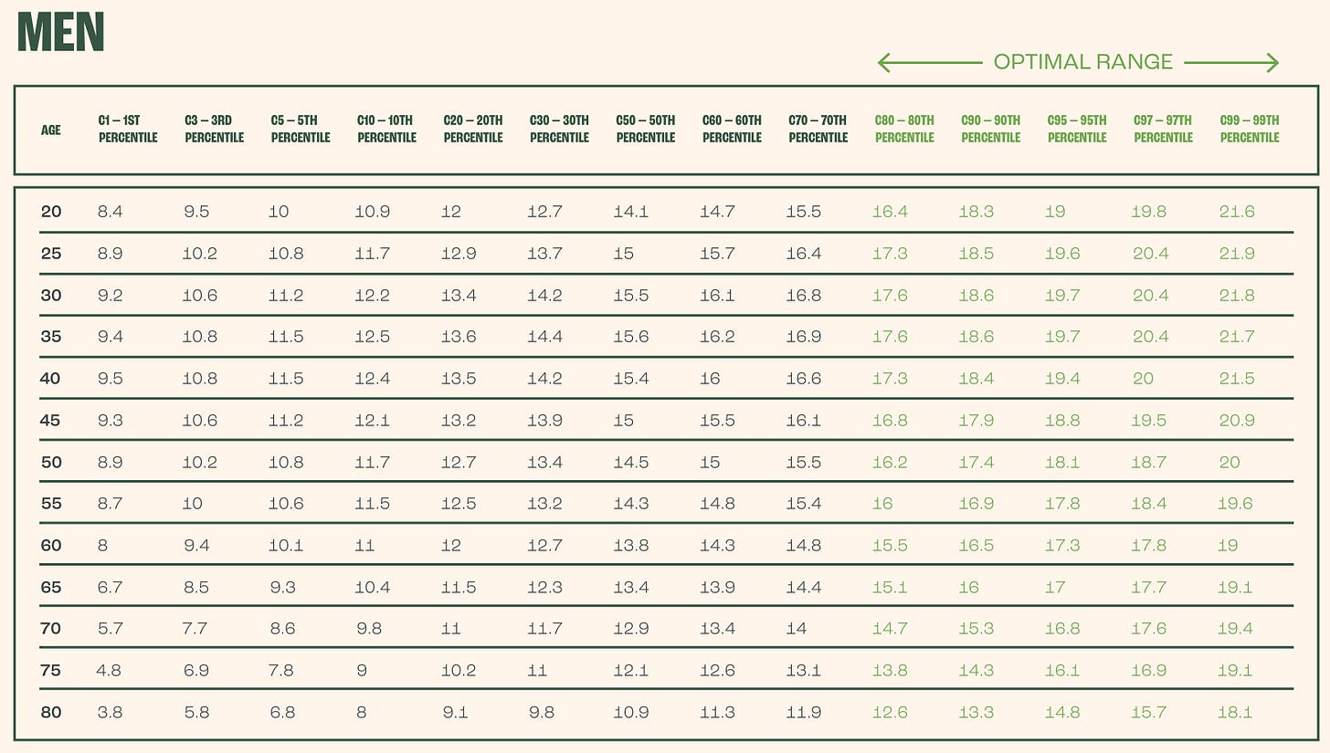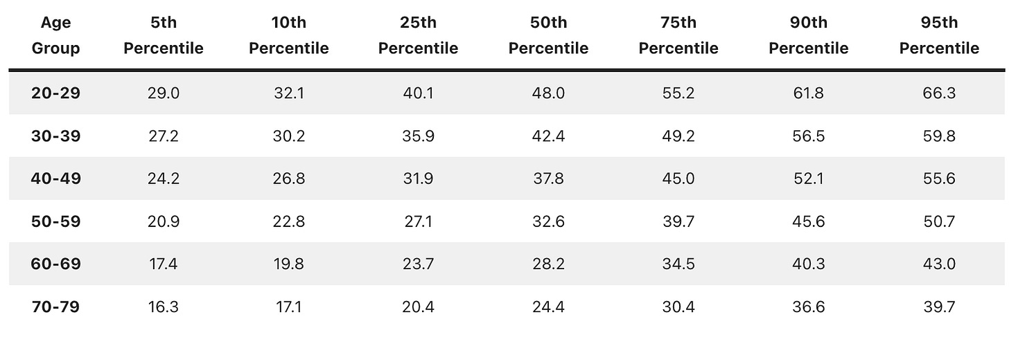 Para comparar los valores obtenidos, divide la medida de tu fuerza de agarre en kg por tu edad en metros elevada al cuadrado. Por ejemplo, una persona que mide 1,75m y que sea capaz de ejercer una fuerza de agarre de 37kg, tiene un valor normalizado de 37/(1,75)^2 = 12,08. Si fuese una mujer de 60 años la situaría (ver tabla más abajo) en un percentil 95 (óptimo).