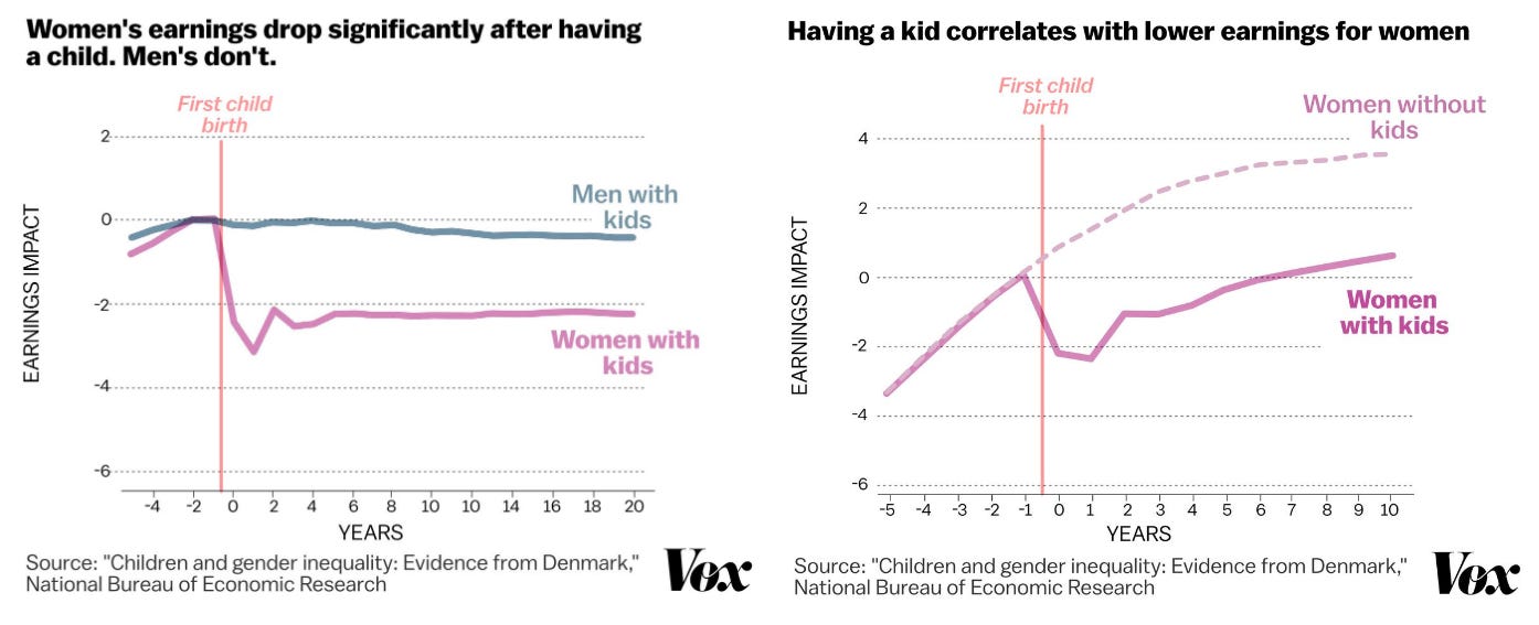 Aunque el debate sobre la brecha salarial lleva abierto ya unos años, poco se ha dicho sobre la fuerte correlación entre esta brecha y la maternidad. Es muy probable que los ingresos que has percibido a lo largo de tu vida sean inferiores a aquellos que ha recibido tu contraparte masculina, no tanto porque eres mujer, sino principalmente porque decidiste ser madre. Lo cual es bastante irónico si tenemos en cuenta que, cuando alguien decide ser madre suele haber otra persona al otro lado que también decide ser padre, pero que aparentemente no parece ser penalizado por ello. La penalización de la mujer es doble porque asume la penalización de ambos.