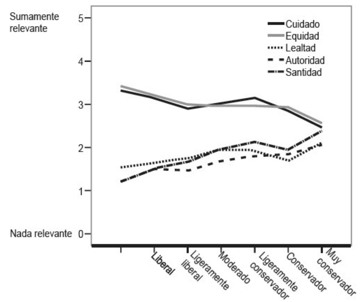 Como puedes ver en la gráfica anterior, las líneas de cuidado y equidad (las dos líneas superiores) son moderadamente altas en toda la gráfica. Todos, izquierda, derecha y centro, dicen que las consideraciones sobre compasión y crueldad, o equidad y la justicia, son relevantes para sus juicios sobre el bien y el mal. Pero las líneas se inclinan hacia abajo, lo que significa que la izquierda consideran que estos temas son un poco más relevantes para la moral que los conservadores. Sin embargo, cuando observamos los fundamentos de lealtad, autoridad y santidad, la historia es bastante diferente. Los liberales rechazan en gran medida estas consideraciones y se evidencia una brecha tan grande entre estos fundamentos frente a los fundamentos del cuidado y la equidad que podríamos decir, en pocas palabras, que los liberales tienen una moralidad de dos fundamentos. A medida que avanzamos hacia la derecha, las líneas se inclinan hacia arriba, y en el punto en el que llegamos a las personas que son muy conservadoras, las cinco líneas han convergido. Podemos decir, también sin profundizar demasiado, que los conservadores tienen una moral de cinco fundamentos.