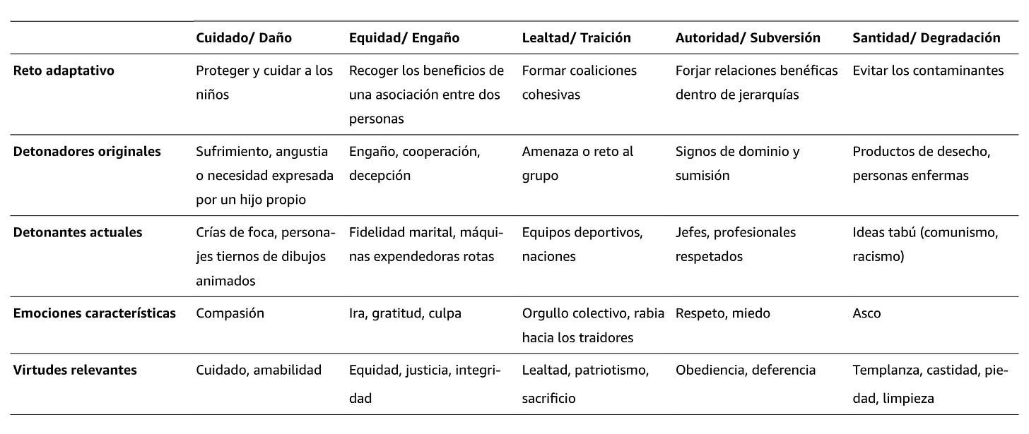 Los cinco receptores del gusto moral asociados a dichos desafíos los llamó fundamentos morales y son: el cuidado, la equidad, la lealtad, la autoridad y la santidad.