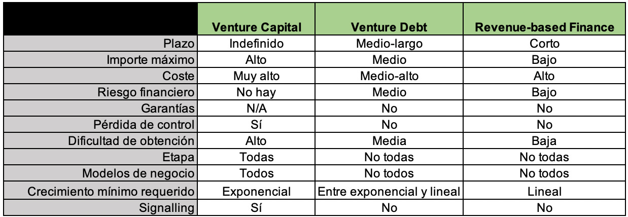 A raíz de nuestra reciente inversión en Ritmo junto con Inveready (Ignacio Fonts) y Sabadell (Sergio Pérez), moderé el pasado martes una sesión sobre tendencias de financiación para startups en la que comentamos diferencias, pros y contras entre los más conocidos venture capital (VC) y venture debt (VD), y el nuevo chico en el barrio: el revenue-based finance (RBF).