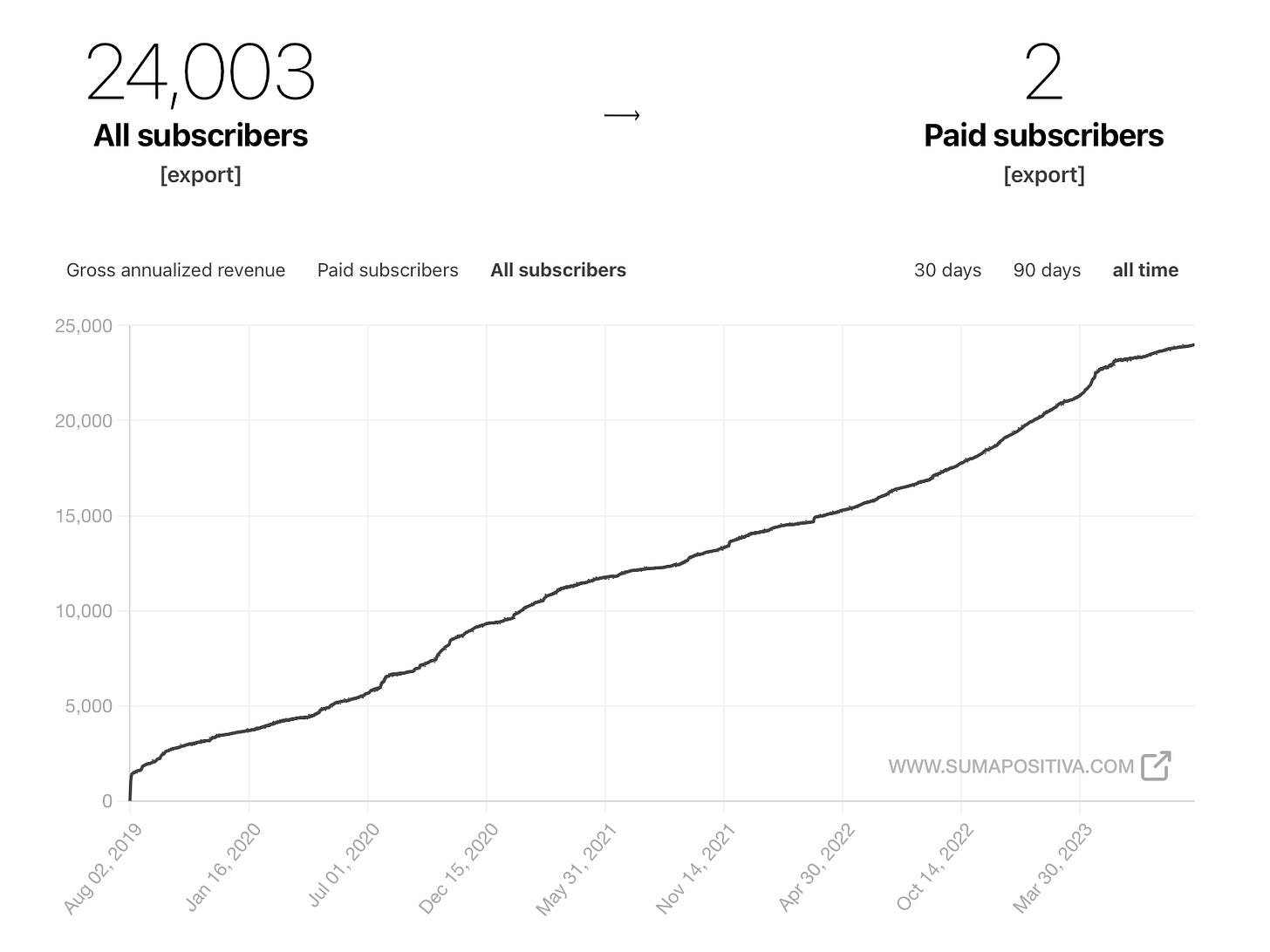 Llevo desde hace mucho tiempo con gran curiosidad por saber qué pasaría si transformase Suma Positiva en una publicación de suscripción, siendo una de las newsletters en español con mayor número de suscriptores. Por cierto, ya somos 24.000 🥳.